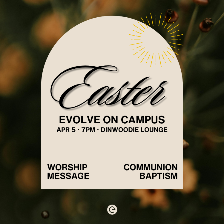 Evolve on Campus!! We're having an Easter service on April 5th at 7:00PM, and we can't wait to see you there! We believe that Jesus died and came back to life three days later. This miracle is what Easter is all about!