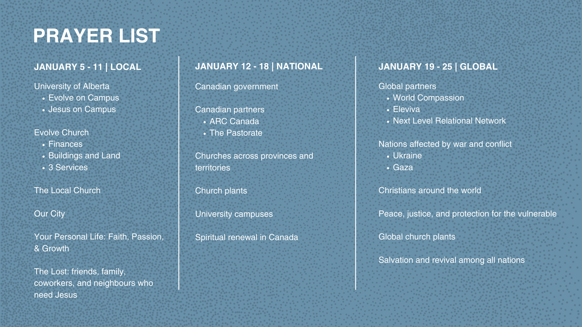 These three weeks are an intentional time to seek God together, align our hearts with His, and lift up the needs of our city, nation, and world. We encourage you to join us as we spend time in prayer as a church community, as we believe God will move powerfully as we seek Him first.
