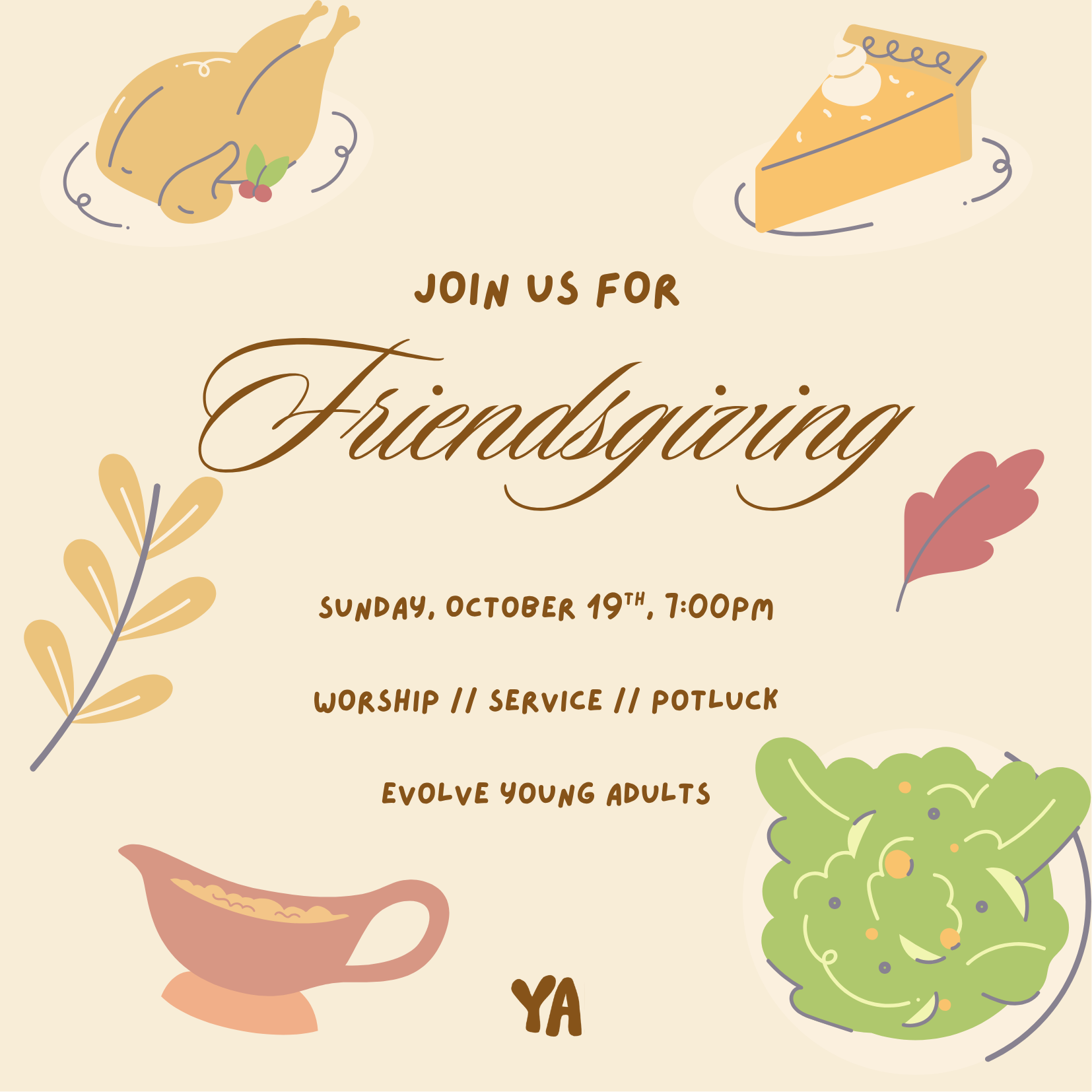 Evolve YA!! Join us at Evolve Church on October 19th starting at 7:00PM for worship, a message, and a friendsgiving potluck afterwards!